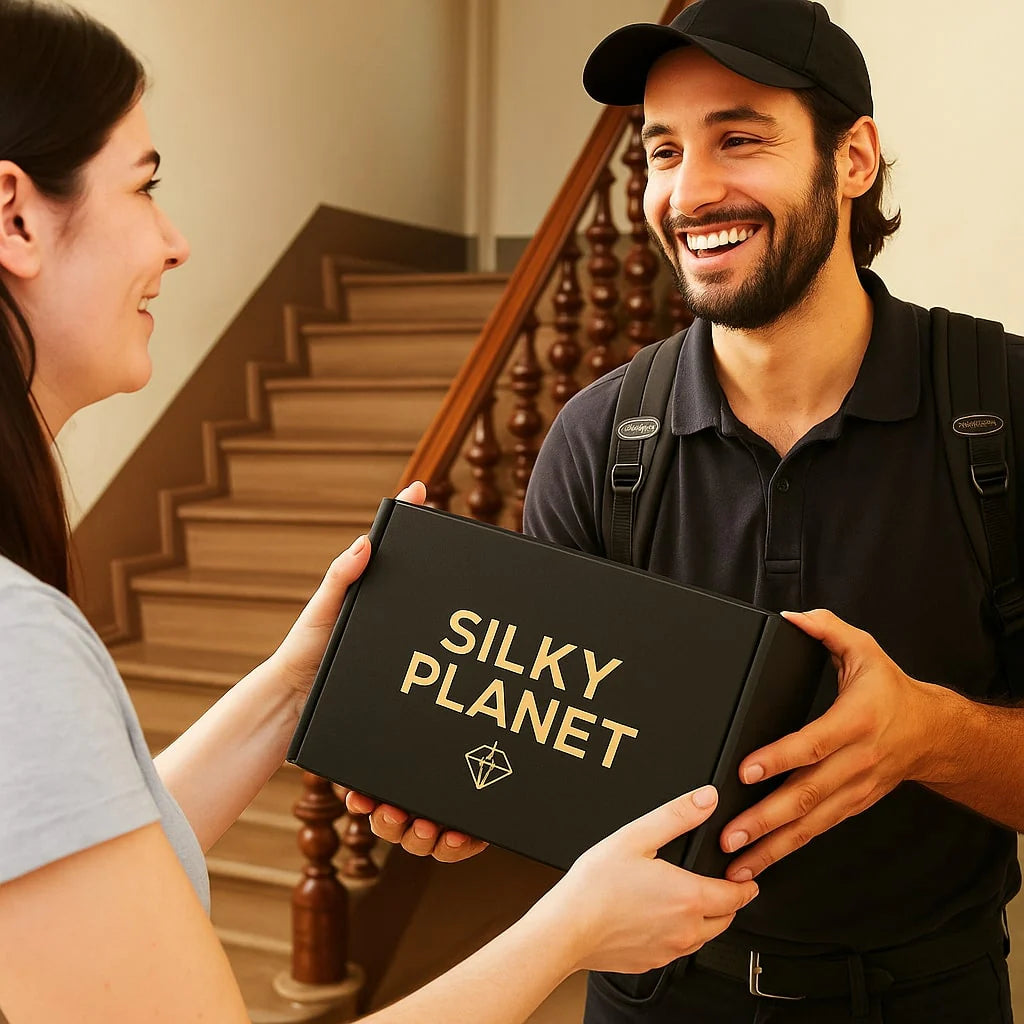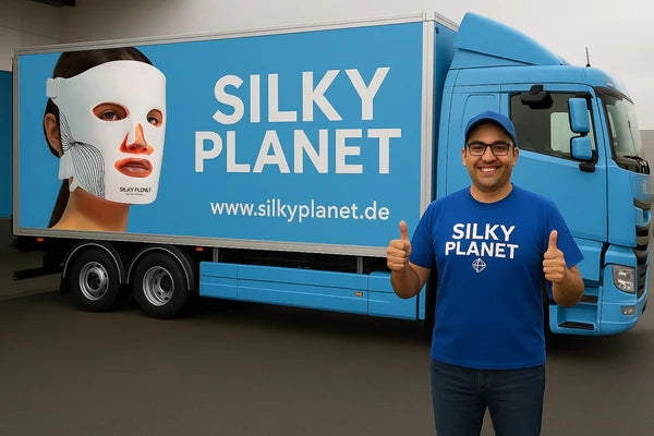 Chaque matin à 6h00, notre camion Silky Planet quitte le dépôt près de Leipzig entièrement chargé des derniers produits de beauté high-tech, emballés avec amour et une promesse : des soins de la peau high-tech directement livrés chez vous.